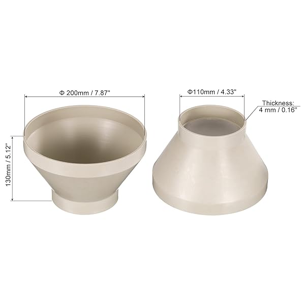 - PATIKIL 8" (200mm) to 4.3" (110mm) Duct Reducer Connector, Heating Cooling Ventilation Tube Fire-Resistant Increaser Adapter Pipe Fitting for Vent System with reliable performance and quality- Inner Diameter: 200 x 110 mm / 7.87 x 4.33 inch (Big*Small); Size: 130 x 4 mm / 5.12 x 0.16 inch (H*T)- Advantage: 1. Make of durable PP material, lightweight, waterproof, moisture resistant and wear-resistant, fire-resistant and pressure resistance, not easy to deform, can be used fo