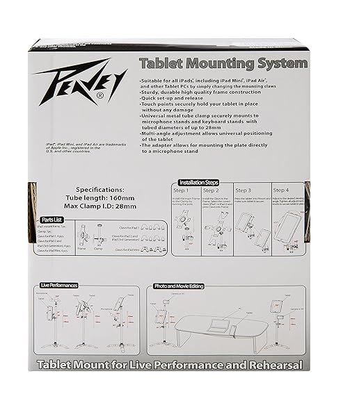 - Peavey - iPad Holder offers reliable performance and quality- Sturdy, durable high quality frame construction- Touch points securely hold your tablet in place without any damage- The mount is suitable for iPad, iPad2, iPad (3rd Generation)- Universal metal tube clamp securely mounts to microphone stands and keyboard stands with tube diameters of up to 28mm