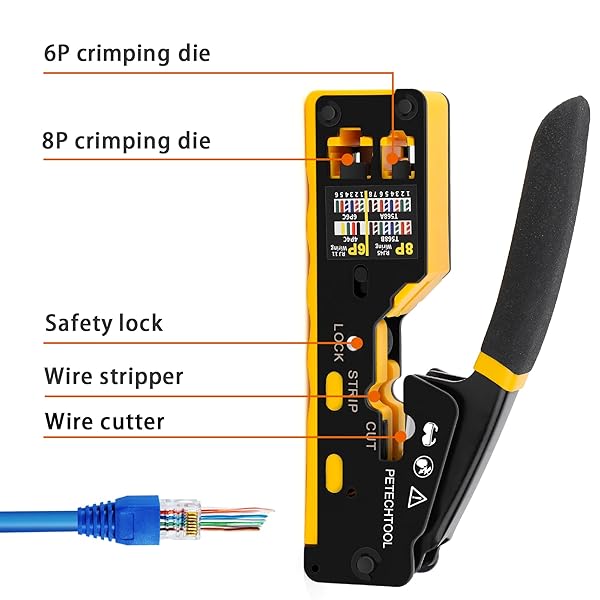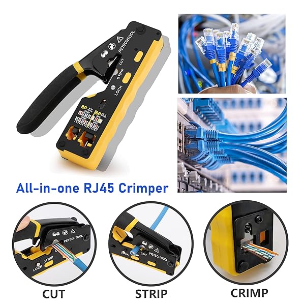 - PETECHTOOL RJ45 Crimp Tool Kit Cat6 Crimping Tool for RJ45 Pass Through Connectors & RJ11/RJ12 Ends with Ethernet Tester, 50Pcs Cat6 Connectors, Wire Cutter, 50Pcs RJ45 Covers, Mini Stripper and Blade with reliable performance and quality- Wide Application - RJ45 crimp tool suits to Cat5 Cat5e Cat6 RJ45 pass through/Non pass through sheild/Non sheild Ethernet connectors and regular RJ11/12 telephone plugs.- Multi Functions - The Ethernet crimping tool adopts an integrated d