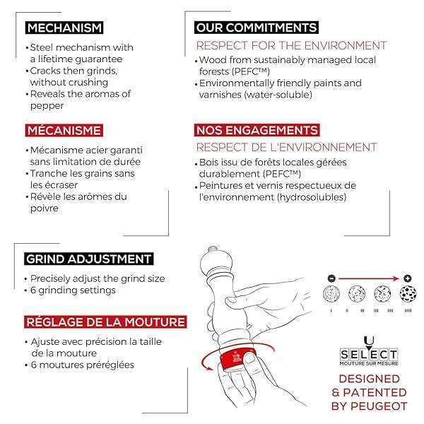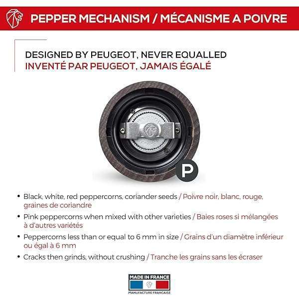- Peugeot Made in France- Paris u'Select Manual Pepper Mill - Adjustable Grinder -PEFC Certified Beechwood, 27 cm - 10.75 in. Chocolate: reliable performance and quality- ICONIC PEPPER MILL The chocolate-colored Paris uSelect pepper mill- USELECT SETTINGS Our patented system helps you select your desired- PRECISION GRIND Through two centuries of experience, we have expertly- ENHANCE FLAVOR The uSelect mechanism brings out all the aromatic
