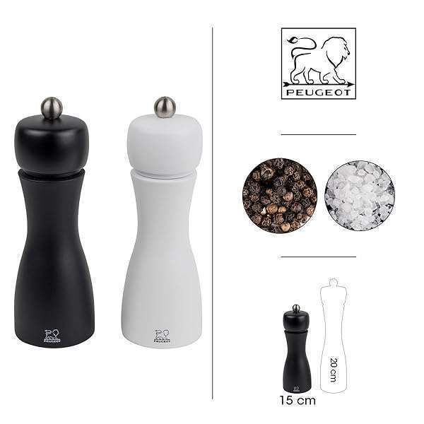 - Peugeot Tahiti 8 Inch Black Pepper Mill and White Salt Mill Set provides reliable performance and quality- Set includes 8-inch beech wood pepper mill with black matte finish and 8-inch beech wood salt mill with white matte finish- Pepper mill has 2 Stage grinding mechanism made of case-hardened steel which is specially treated to keep the teeth razor sharp and protect from corrosion- Salt mill mechanism is designed to resist corrosion from dry salts