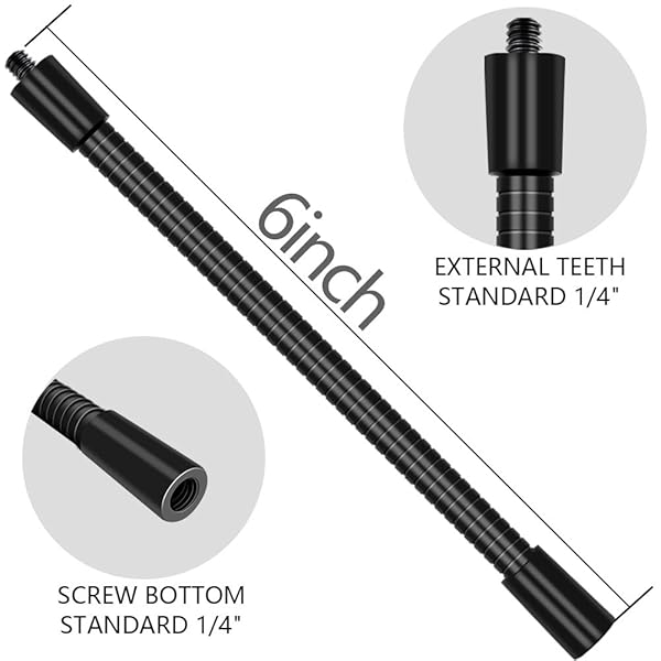- Gooseneck 6 inch 1/4' Threaded Male Female Gooseneck Arm for Webcam/Microphone/Tripod and Phone Camera Light (2pcs) Flexible Metal Arm offers reliable performance and quality- Gooseneck made of high-quality aluminum alloy- For Tripod head, phone holder, Go pro camera,Microphone/mini Light- Universal Metal Grease Hose: Flexible grease hose available for 360 degree rotation and can be adjust to any angle- 2*GooseneckMax Load Capacity 0.66lb / 302g