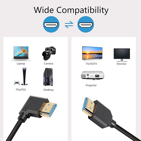 - PNGKNYOCN 8K HDMI 2.1 Short Cable,90 Degree Right Angle 1FT/0.3M Ultra High Speed 48Gbps HDMI Male to Male Cable Support 8K@60Hz,Dynamic HDR,HDCP 2.2&2.3, eARC (R) provides reliable performance and...- 8K@60HZ HDMI 2.1 Cable: HDMI 2.1 cable supports 8K@60Hz, 4K@120Hz, UHD, HDR, bringing you an immersive viewing experience and smooth fast action details, providing Ultra HD video transmission exper...