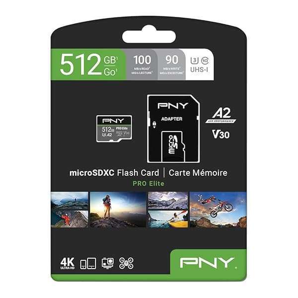 - PNY P-SDUX512U3100PRO-GE 512GB PRO Elite Class 10 U3 V30 microSDXC Flash Memory Card - 100MB/s, Class 10, U3, V30, A2, 4K UHD, Full HD, UHS-I, Micro SD offers reliable performance and quality- Class 10, U3, V30 speed class performance with read speeds up to 100MB/s, and write speeds up to 90MB/s for fast and smooth HD Photography and 4K Ultra HD Videography