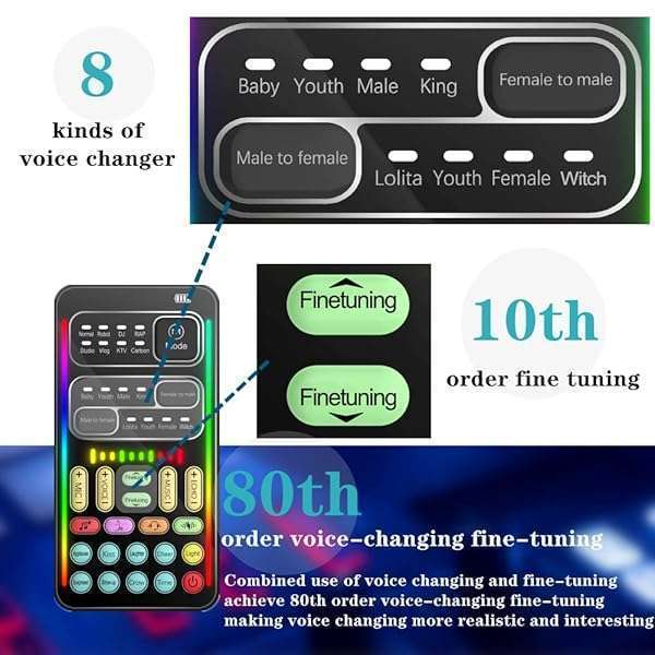 - Portable Voice Changer, 2rd Generation i9 Live Sound Card, Cool Lights Sound Board - Voice Disguiser/Modulator for PS4/PS5/Xbox One/PC/Phone/Laptops with Adjustable Voice Functions provides reliabl...- Gaming Voice Changer - With portable voice modulator, you can change your voice during online games in Real-Time. Combined use of voice changing and fine-tuning to achieve 80th order voice-changing...