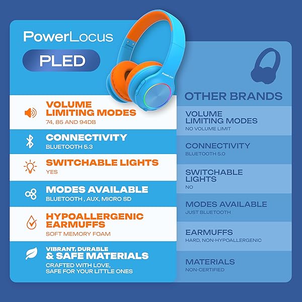 - PowerLocus PLED Kids Bluetooth Headphones, Kids Wireless Headphones with LED Lights, 74/85/94dB Safe Volume, Micro SD, AUX Cable, Hi-Fi Stereo, Built-in Mic Over Ear Kid Headphone for Travel/Tablet/PC: reliable performance and quality- [Probably the best kids wireless headphones] Our kids- [Thrilling Hi-Fi Audio] Safe headphones for kids with- [Durable, Foldable and Lightweight] Kids headphones- [Kids Bluetooth Headphones with Microphone] Your kids