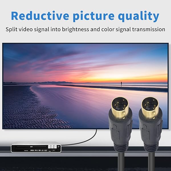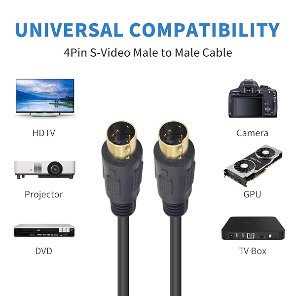 - Poyiccot S-Video Cable 9.8ft, Mini DIN 4 Pin S-Video Cable Male to Male Gold Plated Connector Support Video Transfer for TV, S-VHS, VCRs, DVD, Camcorders, Video Cards, 28AWG with reliable performance and quality- S-Video Cable:Used to your DVD player, satellite receiver, cable box, VCR, or camcorder to a s-video equipped TV or monitor.- Mini DIN 4-Pin Connector Designed to transmit video and enhance image quality. Before buying make sure you equipment has the 4 pin mini DIN