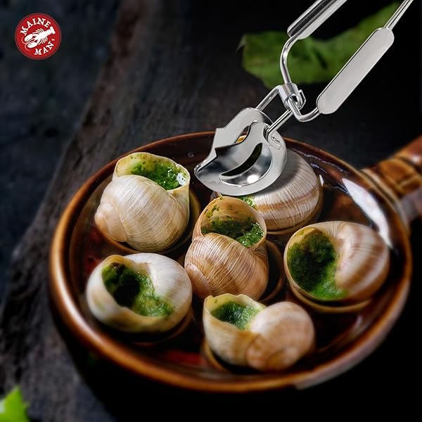 * Maine Man Escargot Snail Dining Tongs, 18/8 Stainless Steel: hics escargot tongs are essential additions to flatware for serving and enjoying escargot * Specially shaped to the natural form of escargot shells * These small tongs help to steady escargots while extracting the meat * Their tiny shells * Especially when basted in a butter sauce