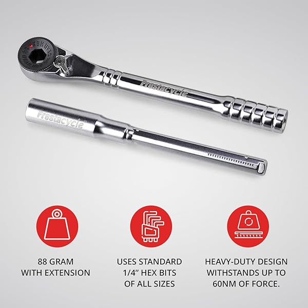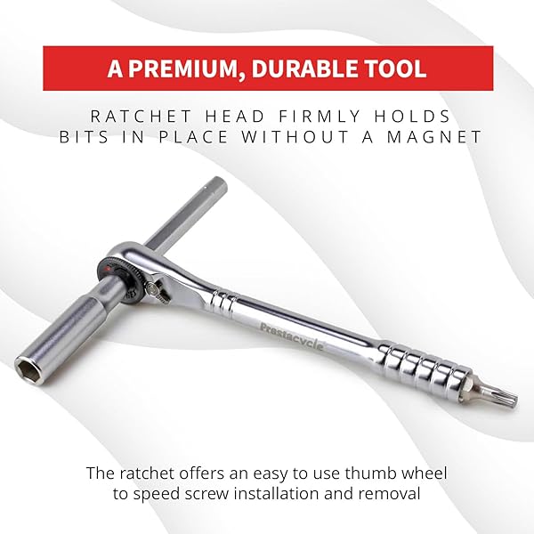 - Prestacycle Pro T-Handle Ratchet and Extension, Portable Tool for use with standard 1/4 Hex Bits (not included), 60Nm Heavy-Duty & Compact Tools For Bicycle (Ratchet & Extension Only) offers reliable performance and quality- Compact & Portable Design: The T handle bit driver is lightweight and easy to carry, making it ideal for on-the-go repairs; Includes a slim 100mm extension that doubles as a T Handle, fitting in any pocket