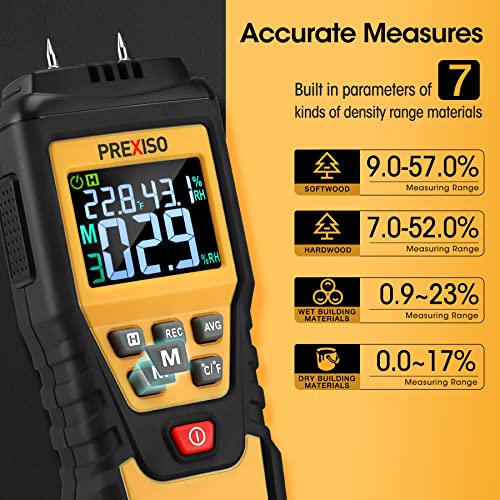 * PREXISO Wood Moisture Meter - 7 in 1Digital Moisture Meter for Firewood, Woodworking, Walls, Home, Drywall, Paper, Floor - Moisture Reader, Pin-Type Water Leak Detector, Dampness Meter: accurate pin-type measurement: designed with 2 high precision pins * For an accurate test read * Stick the stainless steel pins into the surface of what you're measuring * Penetrate into the test surface and quickly know the moisture level in your walls * Remove all of the guesswork with this moisture detector