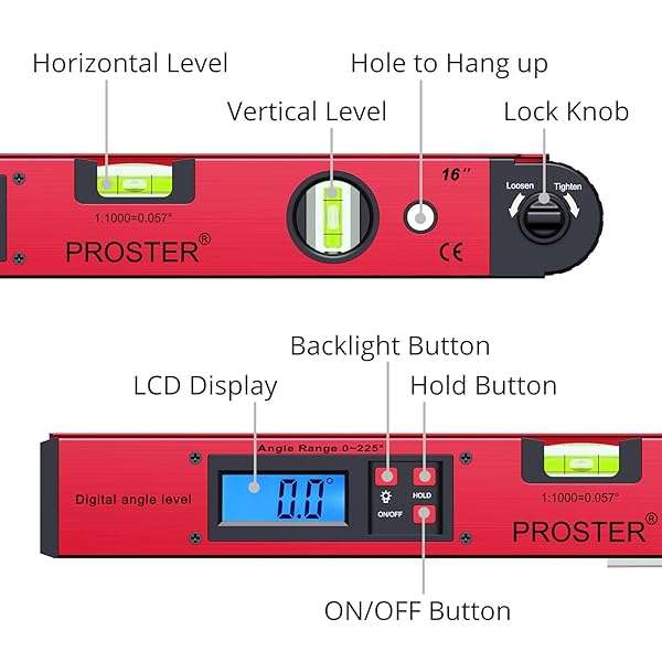 - Proster Digital Angle Finder Gauge - 0~225 Angle Gauge LCD Digital Protractor Spirit Level Meter for Carpenter Woodworking Home Decoration: reliable performance and quality- Angle Finder--- This Digital Protractor Can Quickly Measure the Angle- Accurate--- Angle Range is 0-225, Measuring precision: 0.5,- Mechanical Lock Knob and Data Hold--- With Lock Knob, Help You to- Multifunction--- LCD Display and Backlight Design Can keep Digital