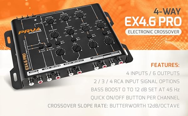 - PRV Audio Crossover Car Audio EX4.6 PRO 4 Way or 3 Way Electronic Crossover 9 Volts, 4 in 6 Out RCA Channels Car Sound Processor - EX4.6PRO offers reliable performance and quality- 2/3/4 RCA Input Signal Options- 9 Volts RMS maximum output- Bass Boost 0 to 12dB set at 45Hz- Quick On/Off button for each channel