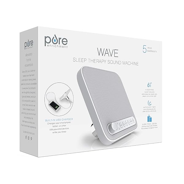 - Pure Enrichment Wave Premium Sleep Sound Machine with USB Charger - Seamless Looping with 6 Soothing All-Natural Sounds, & Auto-Off Timer - Easily Portable for Travel (White) Patented Design offers reliable performance and quality- Set the Mood for Sleep: This premium sound machine helps you get a deeper, more restful nights sleep and drown out distractions. It is perfect for use in bedrooms, nurseries, or while staying at hotels and resorts