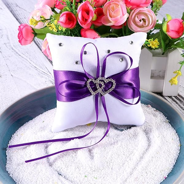 - Wedding Ring Pillow, 4 x 4Inch Purple Bridal Ring Bearer Holder Cushion Double Heart Wedding Ring Box Wedding Accessories Decoration Supplies offers reliable performance and quality- The item is a simple and delicate wedding ring pillow, which is decorated with satin ribbons and sparkling rhinestones double heart buckles to tie the ring- It's for wedding and ceremony. Besides, the pillow comes with a strap at back for ring bearer or page boy to hold