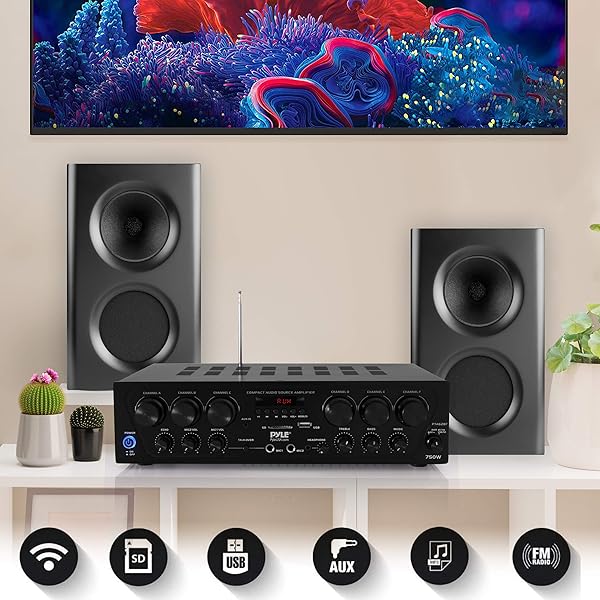 - Pyle Wireless Bluetooth Karaoke-6 Channel 750 Watt Home Audio Sound Power Stereo Receiver Amplifier w/USB, Headphone, 2 Microphone Input w/Echo, Talkover for PA PTA62BT, AUX, Black provides reliabl...- 750 WATT POWER: The Pyle 6-Channel Bluetooth Home Audio Amplifier is perfect for your PA and home theater entertainment. It gives you 750W peak power which can be used for multi speakers w/ 4-8 ohm...