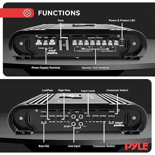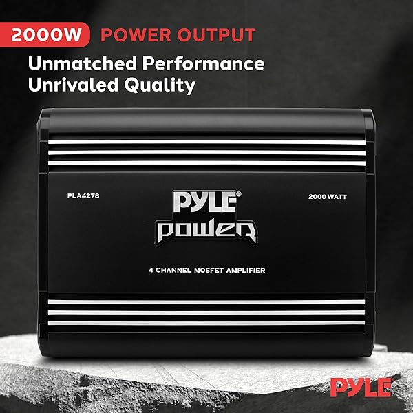 - Pyle 2000W 4-Channel Car Stereo Amplifier - Bridgeable MOSFET Power - Bass Boost Control - Crossover - Silver-Plated RCA Inputs/Outputs - Thermal & Short Circuit Protection - Compact Design - PLA4278: reliable performance and quality- 2000 WATT POWER: The Pyle 4 Channel Car Amplifier is- SILVER-PLATED RCA PORTS: The RCA ports are- MOSFET PULSE: The MOSFET pulse width modulation power- THERMAL PROTECTION: To keep both your car and the