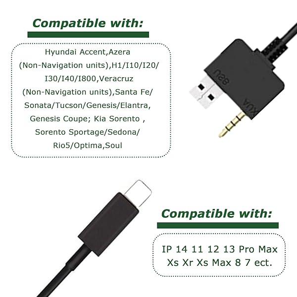 * Qkansiw Car 3.5mm Jack Aux Cable Music Interface Adapter Compatible with Hyundai Kia for IP 14 Pro Max 13 12 11 Pro Max X Xs Max XR 8 7 Plus: 2 in 1 design * Aux and charging function to make sure you can enjoy Hi-Fi lossless music your mobile devices at same time * You can say goodbye to "out of juice" in your long term trip from now on * A perfect solution for getting your mobile music playing through your car stereo and charging your devices at same time whenever you go on your car *