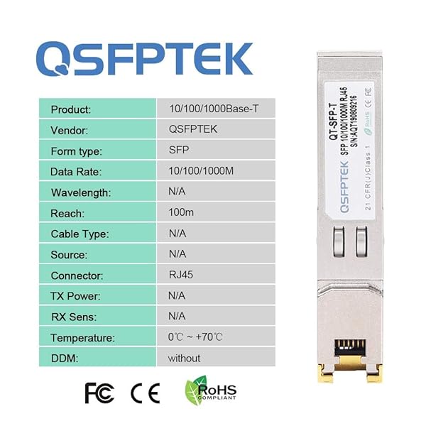 - QSFPTEK 1.25G SFP-T Gigabit SFP Copper Ethernet Module, SFP to RJ45, 10/100/1000BASE-T Mini gbic Transceiver for Cisco GLC-T/SFP-GE-T/GLC-TA, Mikrotik SRJ01, Netgear, Supermicro, up to 100m offers reliable performance and quality- 1.25G SFP to Ethernet Compatible for Cisco GLC-T/GLC-TE/GLC-TA, Mikrotik S-RJ01. Widely used in fiber switches, routers, NIC, server or other fiber optic equipments with 1Gb SFP ports
