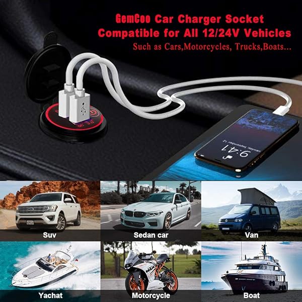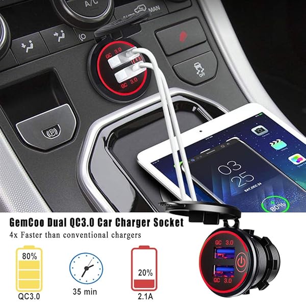 - Quick Charge 3.0 Dual USB Car Charger Socket with Touch Switch 12V/24V 36W QC3.0 Dual USB Fast Charger Socket Power Outlet for Marine, Boat, Motorcycle, Truck, Golf Cart(Red) provides reliable perf...- [Dual QC3.0 USB Ports] This car usb charger has dual 18W / 3A QC3.0 charging ports, which is 4x faster charging ports than conventional chargers. Compatible with Quick Charge 2.0 and 1.0. Suitable ...