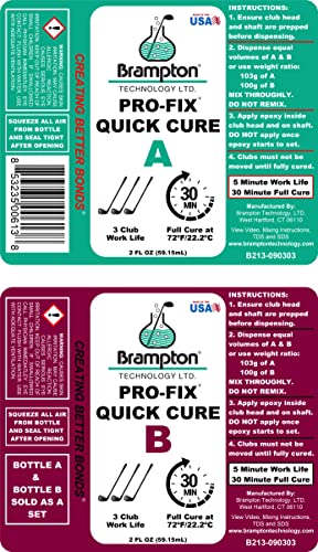 - Brampton PRO-FIX Quick Cure Golf Epoxy - 1 Hour Golf Club Repair - Golf Epoxy for All Golf Shafts, Golf Heads, Drivers, Putters, and Irons - Engineered for The Golf Industry (4 oz Kit) offers reliable performance and quality- QUICK CURE EPOXY: The PRO-FIX Quick Cure Golf Epoxy has a 5-minute work life, allowing you to bond 3 clubs per mix. Fully cured in 1 hour, its made for fast, reliable golf club repairsso you can get back on the course in no time