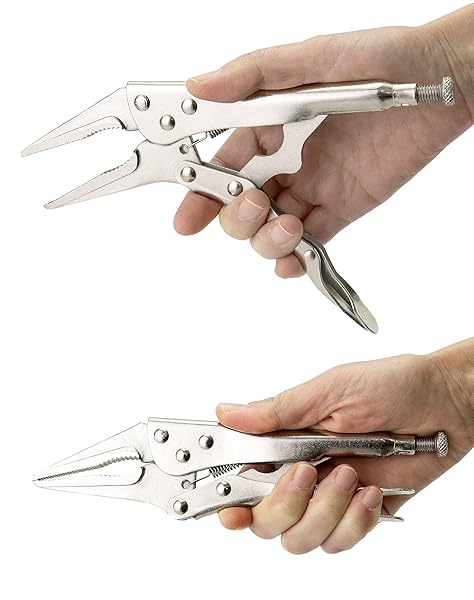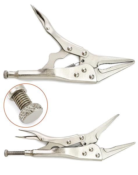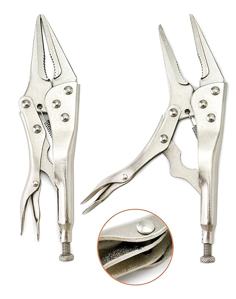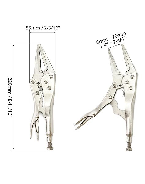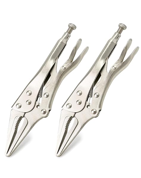 - QWORK 2 Pack Original Locking Pliers - 9" Long Nose, Curved Jaw, 2-3/4" Max Opening with reliable performance and quality- Easy to Grab: Curved jaws with hardened teeth designed to grab a variety of shapes from any angle, the long and straight nose facilitates access to narrow, hard-to-reach places.- Classic Trigger Release: Quick and easy locking and releasing action, provides maximum locking force.- Size: 2-3/4" Maximum opening, 9" long nose pliers, hardened teeth