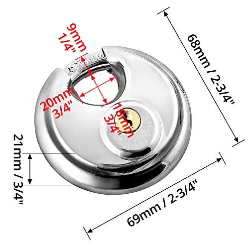 - QWORK Disc Locks, 2 Pack Heavy Duty Steel Keyed Different Padlock Disc Storage Locks for Storage Unit, 3/8" Shackle offers reliable performance and quality- Size - 2-3/4 inch wide lock body, 3/8 inch diameter shackle, 3/4 in high lock- Safe - Hardened steel shackle for increased strength and security- Material - waterproof stainless steel construction can hold extreme weather environments