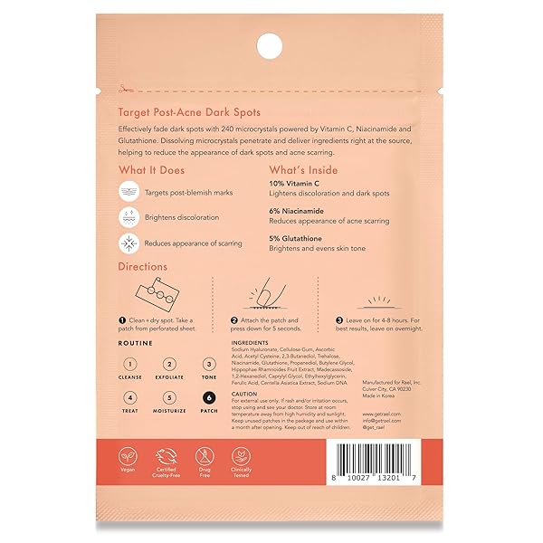 * Rael Pimple Patches, Miracle Microcrystal Vitamin C Dark Spot Cover - Hydrocolloid Patch with Glutathione and Niacinamide, Korean Skin Care (9 Count): ingredients * 10% Vitamin C * 6% Niacinamide * And 5% Glutathione * Reliable performance