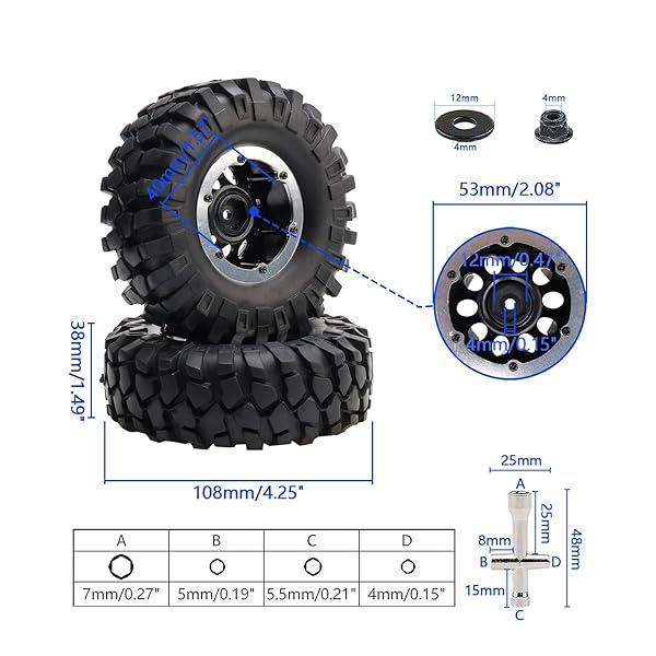 - Rchobbytop 4-Pack 1.9 Inch OD 108mm Tires and 12mm Drive Hex Wheel Rims for 1/10 RC Rock Crawler Short Course Truck Traxxas Slash 4x4 VXL VKAR Redcat SCX10 CC01 RC4WD D90 offers reliable performance and quality- Tire Outer Diameter: around 108mm / 4.25"; Tire Inner Diameter: 1.9"; Tire Width: around 38mm / 1.5"; Drive Hex Size: 12mm, Axle Hole Diameter: 4mm
