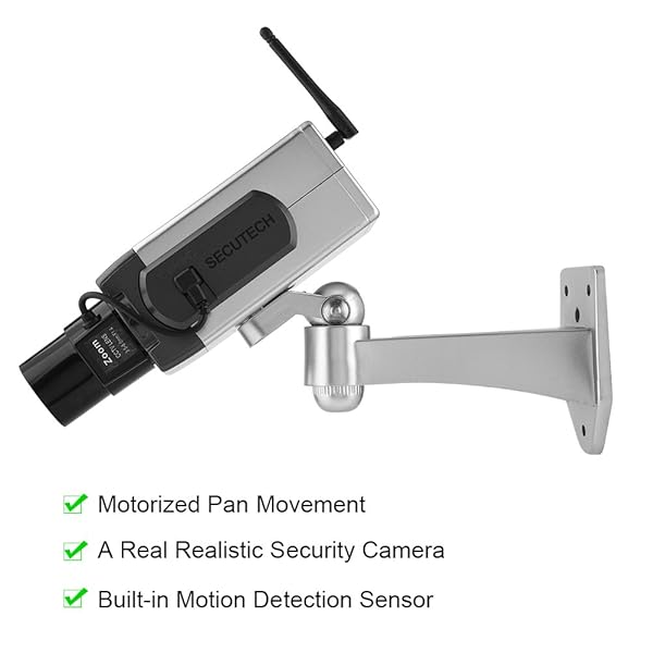 - Fake Security Camera, Emulation CCTV Auto Rotation Movement Security Camera Surveillance System with Realistic Look Flashing LED for Home Store Indoor offers reliable performance and quality- AUTO ROTATION: There is a built-in motion detection sensor and an antenna. When sensing a motion, it will activate the activation light and turn the camera through its motorized pan movement, rather other following people. It makes the bullet camera look very realistic