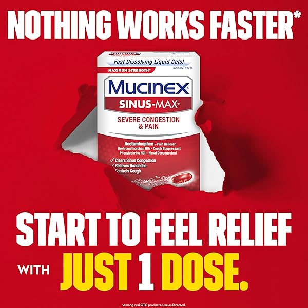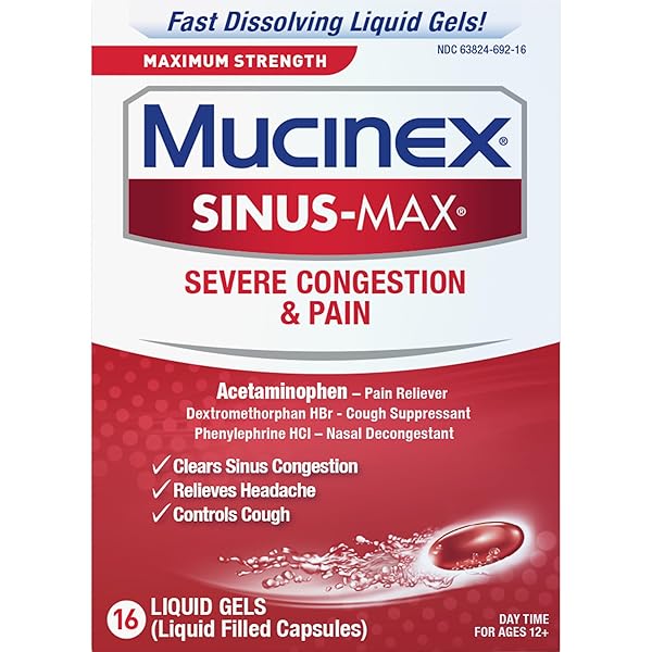 * Mucinex Sinus-Max Max Strength Severe Congestion & Pain Liquid Gels, 16ct: maximum strength mucinex sinus-max severe congestion & pain is an otc medicine for relief of your multi-symptom sinus relief * Maximum Strength Mucinex Sinus-Max Severe Congestion & Pain helps relieve pain * Headache * Cough * Nasal congestion and sinus congestion