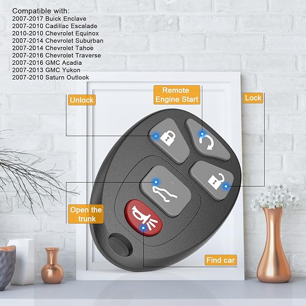 - Remote Key Fob Replacement Fits for Chevy Traverse 2007-2016 Tahoe Suburban GMC Acadia Yukon XL Buick Enclave Cadillac Escalade Saturn Outlook FCCID: OUC60270 OUC60221 15913415 with reliable performance and quality- COMPATIBILITY: Compatible with Cadillac Escalade 2007-2010/ Cadillac SRX 2007-2008 Chevrolet Suburban 2007-2014/ Tahoe 2007-2014/ Traverse 2009-2016/ Acadia 2007-2016/ GMC Yukon 2007-2014/ Saturn Outlook 2007-2010/ Buick Enclave 2008-2017. Please Check Our Product Desc