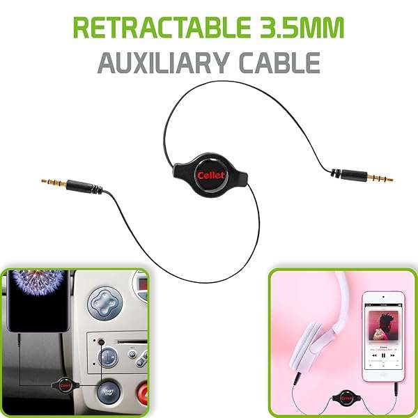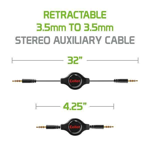 - Cellet Retractable Stereo Auxiliary Cable 32" Extendable Aux Cord for Car, Headphones, Speakers & More Compact, Tangle-Free Design 3.5mm Male to 3.5mm Male Audio Jack Black provides reliable pe...- Premium Stereo Sound Crystal-clear audio quality for music, podcasts, and calls.- Car-Ready Design Easily connect your phone or music player to your car stereo.- Retractable & Compact Extends up to 32" and retracts to just 4.25" for easy storage.