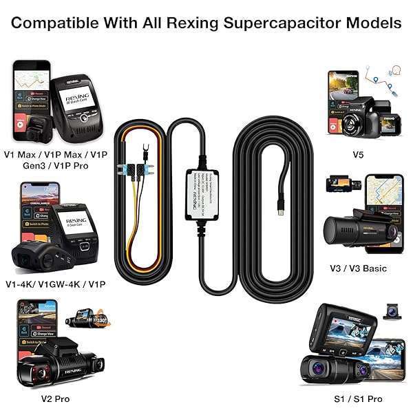 - Rexing Smart Hardwire Kit Mini-USB Port V1 V1P WiFi Version V3 and S1 Dash Cams offers reliable performance and quality- Made to use with All Rexing Supercapacitor Models - V1-4K, V1P, V3, V2 Pro, V5, S1 Series, V1P Pro Series, Max Series dash cams,etc- Input: DC12V-24V. Output: 5V, 1.5A, Mini-USB Port- Low voltage protection: 11.4V- Cable Length: 13ft