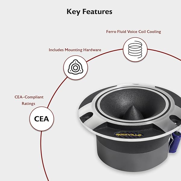 - Rockville RT5 Aluminum Tweeter Pair, 2.8", 120W, 4 Ohms, Titanium Diaphragm, Kapton Voice Coil, High Sensitivity, CEA, Perfect for Car and Pro Audio offers reliable performance and quality- High-Performance Tweeters: Rockville RT5 pair delivers 120W peak power (60W RMS) with a titanium diaphragm for clear and precise highs- Advanced Voice Coil: 1 high-temperature die-cast Kapton voice coil with ferrofluid cooling for reliable and distortion-free sound