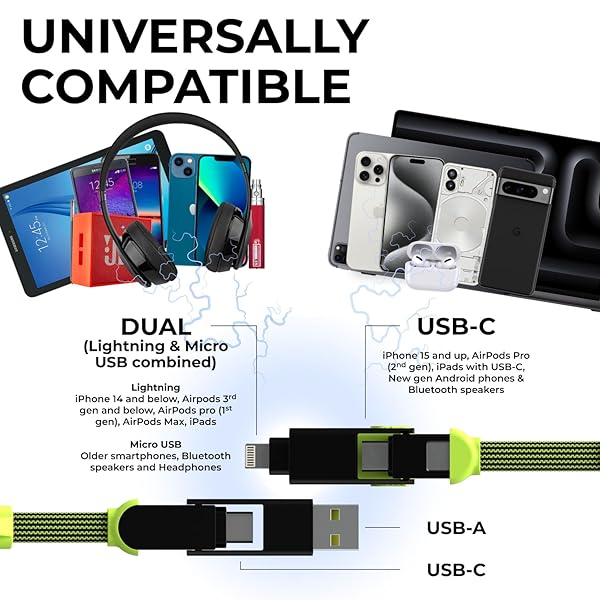 - Rolling Square inCharge XL Pocket - 6-in-1 Portable Universal Charging Cable, USB-C, Lightning, USB-A and Micro USB, 100W Ultra-Fast Charging Power, 0.5ft/15cm, Black/Lime offers reliable performance and quality- Unique design: This universal cable cord's patented design allows you to connect any portable device to any power source for charging: USB-A to USB-C, USB-A to Lightning, USB-A to Micro USB, USB-C to USB-C, USB-C to Lightning and USB-C to Micro USB