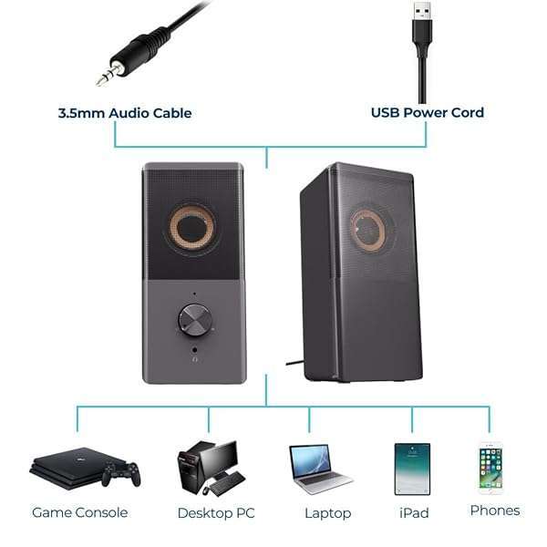 * ROSON Computer Speaker, Compact Size Speaker with Headphone Jack, Enhanced Bass and Volume Control, Stereo 2.0 USB Powered 3.5mm Aux Multimedia Speakers for Laptop/Desktop/Tablets/Phone: easy operation & full compatibilities * Just plug and play * The usb cable for power and the aux in cable for the sound * Work with any device that has a standard 3.5mm headphone jack * Such as desktops