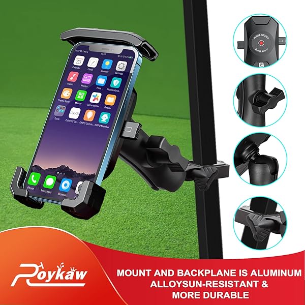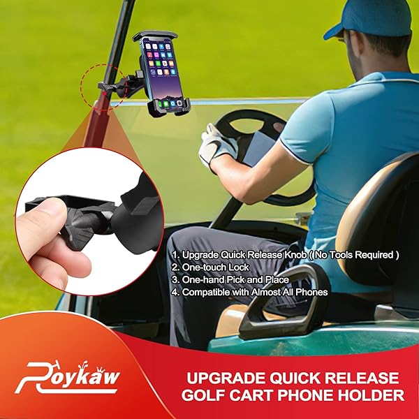 - Roykaw Golf Cart Phone Mount Holder Compatible with EZGO/Club Car/Yamaha, Upgrade Quick Release & One-Touch Lock, Compatible with iPhone/Galaxy/Google Pixel/Motorola/All 4.7"-6.8" Devices with reliable performance and quality- Specifically Designed: This phone mount holder fits compatible with EZGO TXT/RXV, Club Car DS/Precedent/YAMAHA etc. Just only for square frame. ( Fits for 3/4", 4/5", 1.0", 1-1/4"square frame)- Adjustable Width: Suitable for the devices which size is