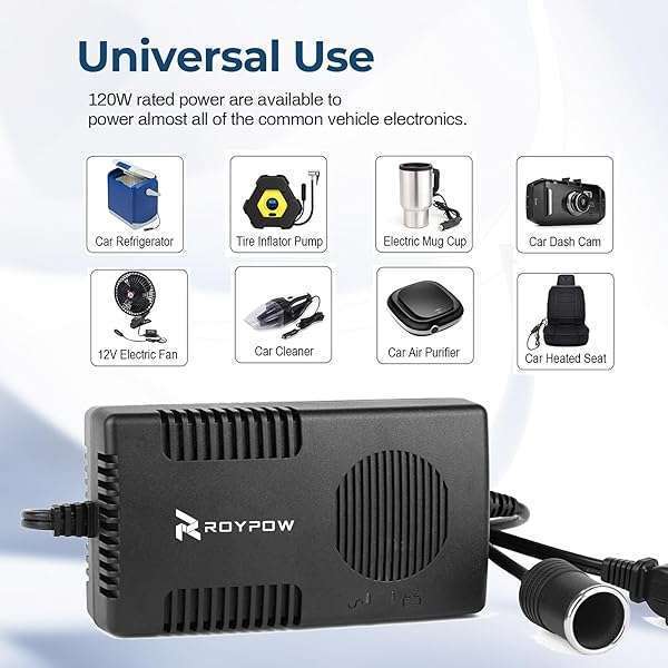 - RoyPow AC to DC Converter, 120W (Max 150W) 120V/110V to 12V/10A Cigarette Lighter Socket AC/DC Adapter, 120V/110V to 12V Converter, Power Supply for Inflator, Car Refrigerator, Car Vacuum Cleaner p...- 12V Universal Use: Used to convert any 100V~120V AC household current to 12V DC power; The unique female cigar lighter socket is beneficial to allow many vehicle electronics to be used at home or i...