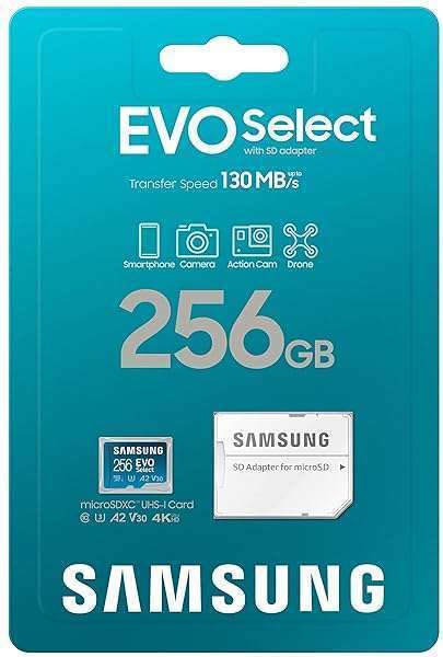 - SAMSUNG EVO Select Micro SD-Memory-Card + Adapter, 256GB microSDXC 130MB/s Full HD & 4K UHD, UHS-I, U3, A2, V30, Expanded Storage for Android Smartphones, Tablets, Nintendo-Switch (MB-ME256KA/AM) p...- ALL THE SPACE YOU NEED: Store tons of media on your phone, load games or download more apps on your tablet at top-notch speed, making transfers seamless and reliable