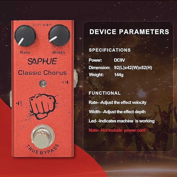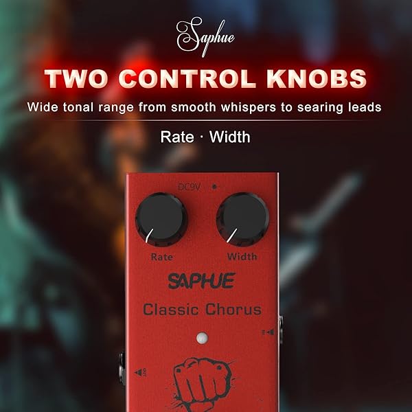 - SAPHUE Classic Chorus Guitar Effects Pedal Rate/Width Knob High Low Frequency Effect Pedals with Steel Metal Shell Mini Single Type Dc 9V with True By offers reliable performance and quality- Classic chorus Crisp and transparent chorus, great for a little embellishment. Full bodied 12-string sounds and deep clear bell like tone- Solid Quality: Aluminium alloy body makes vintage overdrive pedal safe for transport, stable and strong
