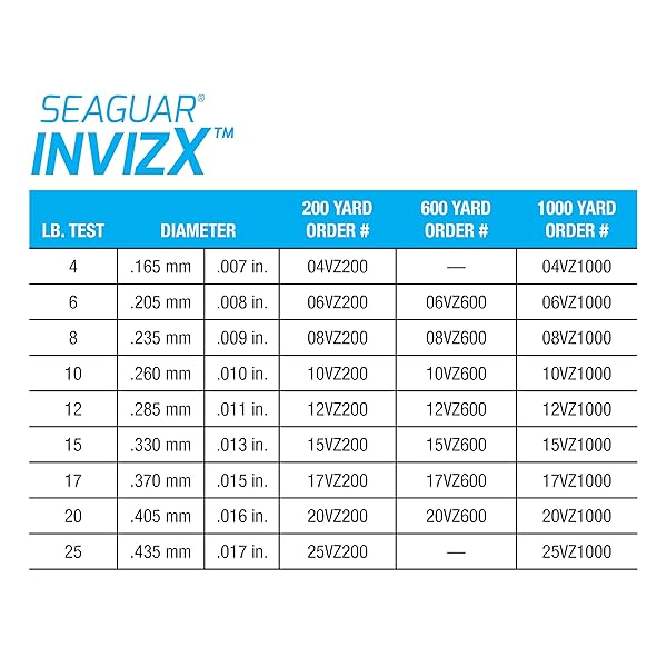- Seaguar InvizX Freshwater 100% Fluorocarbon Fishing Line 10lbs, 600yds Break Strength/Length - 10VZ600 offers reliable performance and quality- Soft, castable and virtually invisible to fish, Seaguar's high-performing INVIZX Fluorocarbon Fishing Line is ideal for both spinning and casting reels- Ideal for freshwater multi-species fishing applications fish cant see it and its very soft and sensitive. Easy to manage on a reel