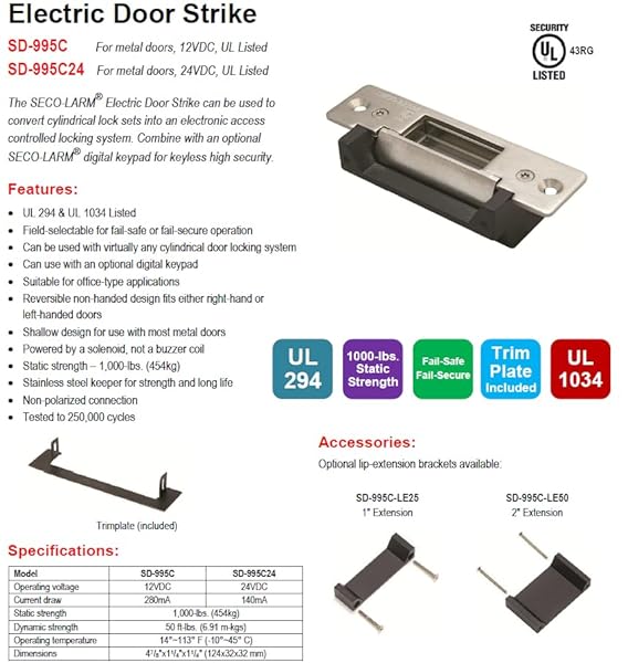 - Seco-Larm SD-995C Fail-Secure or Fail-Safe Electric Door Strike for Metal Doors, Static Strength 1000 lbs. (454kg), Can Be Used with Virtually Any Cylindrical Door Locking System provides reliable ...- Field-selectable for fail safe or fail-secure operation- Reversible non-handed design fits either right hand or left-handed doors- Shallow design for use with most metal doors- Powered by a solenoid, not a buzzer coil