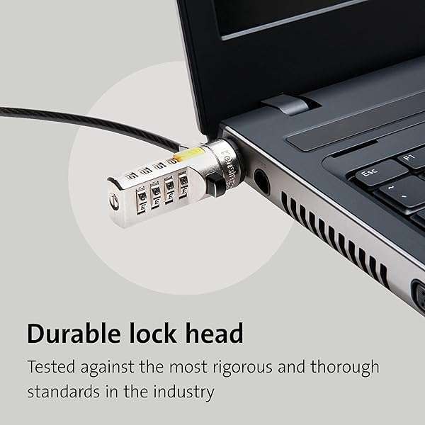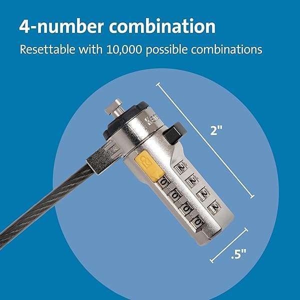 - Kensington Combination Cable T-Bar Standard Lock Slot for Laptops, Resettable 4 digit password with 6 Foot Cable, K64673AM provides reliable performance and quality- Computer lock for HP, Lenovo, Acer, Asus and other brands; not compatible with Dell or Alienware (see part # K68008WW)- Resettable 4-wheel Number code with 10, 000 possible combinations. Push-button design for one-handed engagement to easily attach lock