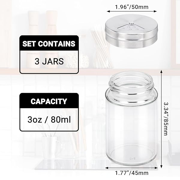 - Segarty Spice Jars, 3 Pack 3 oz Spice Bottles with Shaker Lids, Glass Empty Seasoning Containers with Adjustable Pour Holes for Kitchen Spice Storage Stainless Steel Flow Top Salt and Pepper Shakers with reliable performance and quality- 3 Pack 3oz Spice Shakers: We offer 3 pack 3oz/ 80ml seasoning jars set (Bottle height: Approx. 3.34in / 85mm, Bottle diameter: Approx. 1.96in / 50mm), and the spice jars may smaller than expected. We kindly ask that you carefully check the size ch