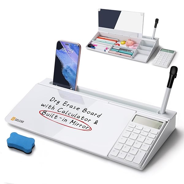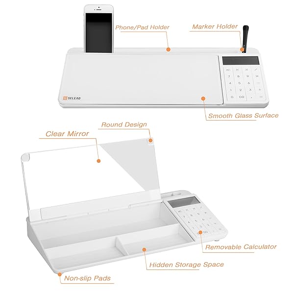 - SELEAD Desktop Glass Whiteboard with Calculator & Built-in Mirror, Dry Erase White Board Computer Pad Keyboard Stand with Organizer Drawer, Desk Accessories for Home, School, Office with reliable performance and quality- MULTIFUNCTIONAL: Writing+Storage+Calculate+Built-in Mirror+Hold+Keyboard Stand, our desktop white board is an all in one multipurpose. Equipped with 1 black dry erase marker and blue eraser. One purchase, All in place!- SMOOTH GLASS SURFACE: Strong and thic