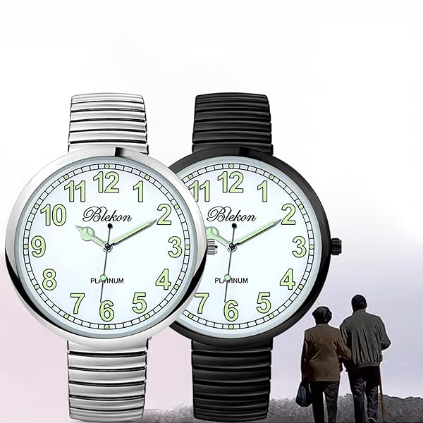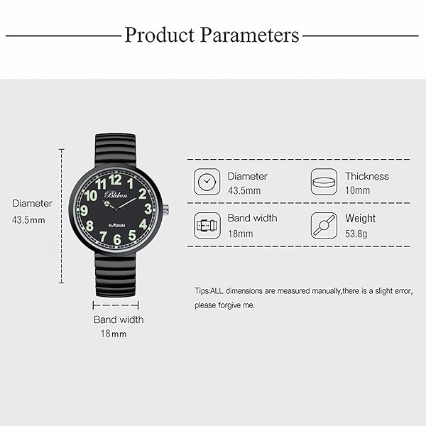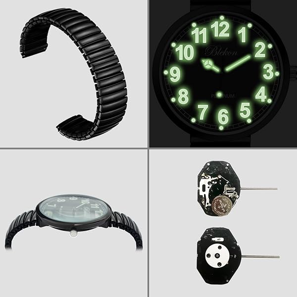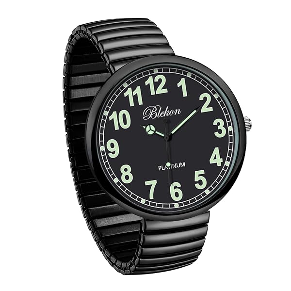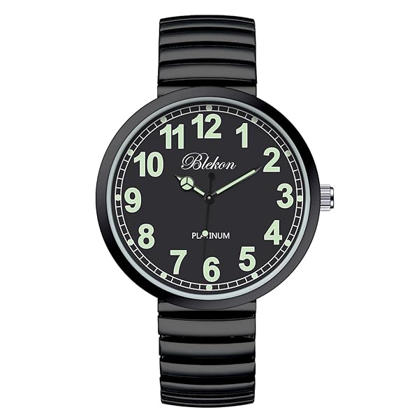 * Blekon Collections New Super Large Face Stretch Band Japanese Movement PC21J Fashion Watch (Black/Luminous): this watch was made out of an alloy case * Large metal stretch band * Glass dial * And analog display * Fixed bezel with a push/pull crown for it to start/stop
