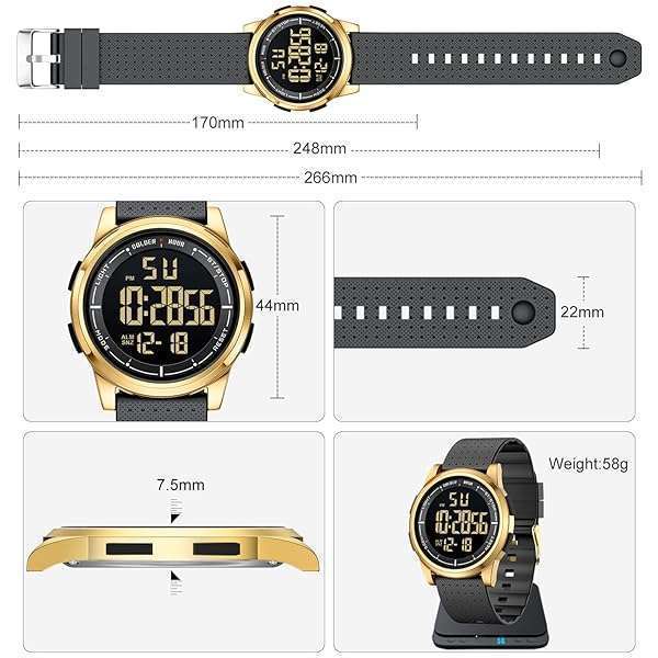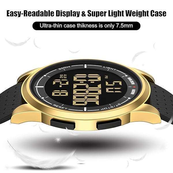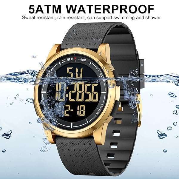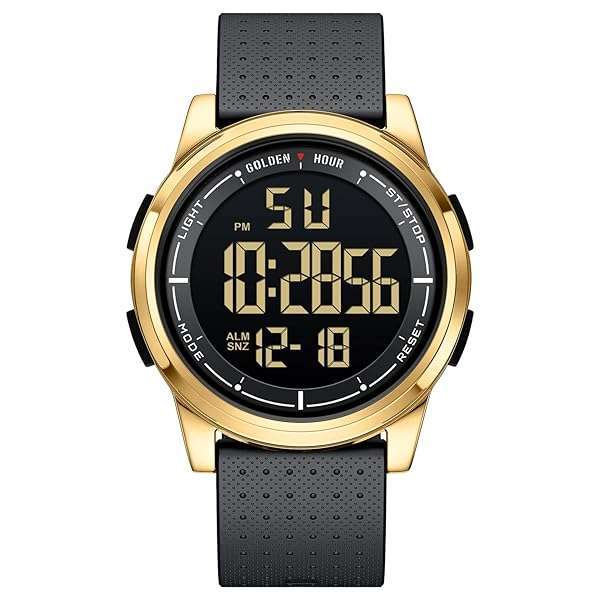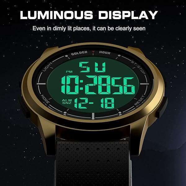 - GOLDEN HOUR Ultra-Thin Minimalist Sports Waterproof Digital Watches Men with Wide-Angle Display Rubber Strap Alloy Steel Case Wrist Watch for Men Women in Gold provides reliable performance and qua...- [DIGITAL MULTIFUNCTION WATCHES]: Imported EL backlight screen, the time can be clearly displayed in the backlight. The digital watch also has 12/24H, stopwatch, alarm, Date and Day.