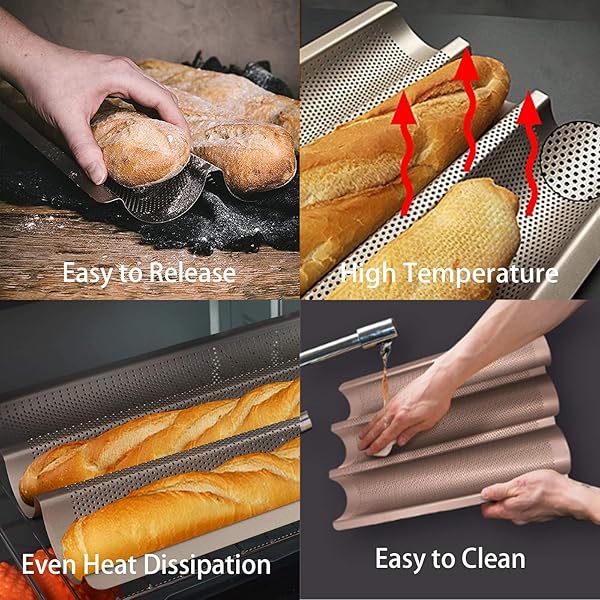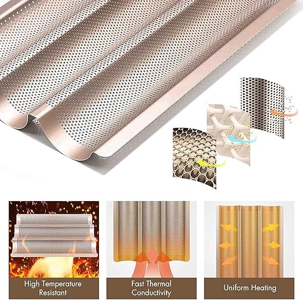 * Baguette Pans for Baking 15" x 11", Carbon Steel 3 Loaf Nonstick Baguette Baking Tray for French & Italian Perforated French Bread Pan: food grade material: professional thickened carbon steel material which provides ease in baking & cleaning * Dishwasher safe * Food-grade Silicone coating * Non-Teflon and no harmful substance release in high temperature * Good Thermal Conductivity: Baguette pan adopts thickened 0.8mm carbon steel to accelerate even heat