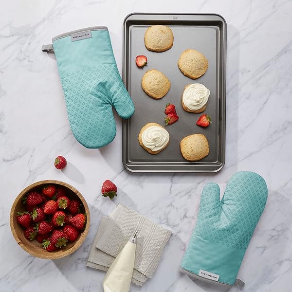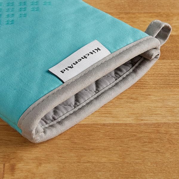 - KitchenAid Asteroid Oven Mitt Set, 7"x12.5", Aqua Sky, 2 Piece offers reliable performance and quality- HEAT RESISTANT COTTON Made of 100 percent durable, heat-resistant cotton, these oven mitts will help shield your hands from heat up-to 302 degrees Fahrenheit- SILICONE PRINT GRIPS - Textured, heart-shaped silicone grips ensure a more secure hold when handling hot cookware