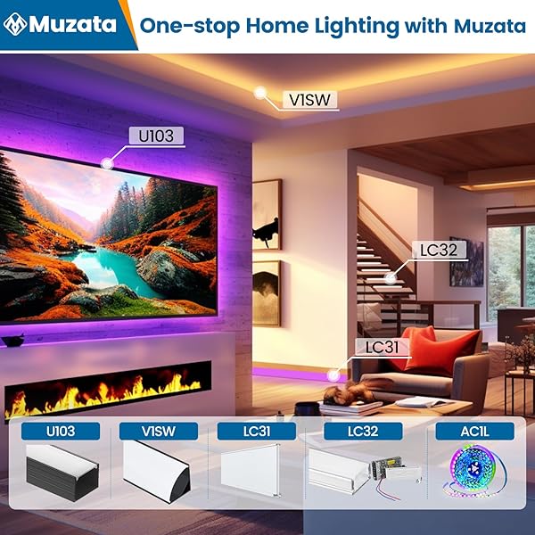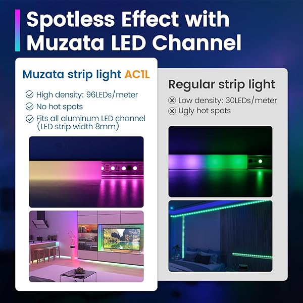 * Muzata 16.4FT/5M 96LEDs/M High Density RGB LED Strip Light Spotless U108 U103 LC31 LED Strip Channel Neon Lighting Effect AC1L (Power Adapter Not Included): one-stop lighting system: muzata is committed to providing customers with one-stop modern lighting solutions for a variety of occasions * We recommend pairing Muzata U108 LED channel for a spotless effect on walls * Muzata U1SW for high ceiling lighting * Muzata V1SW for spacious and bright corners * And Muzata LC31 for colorful mood